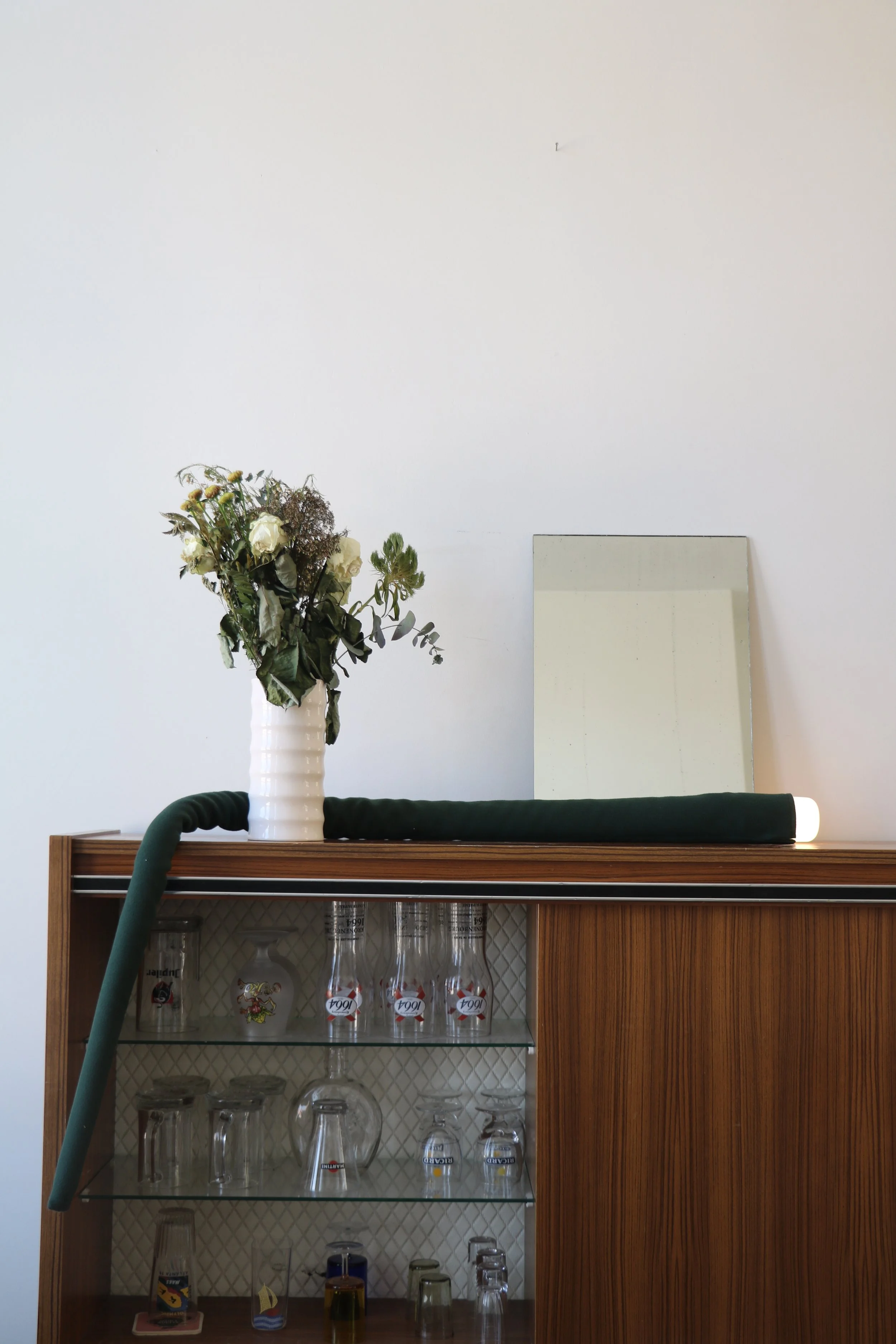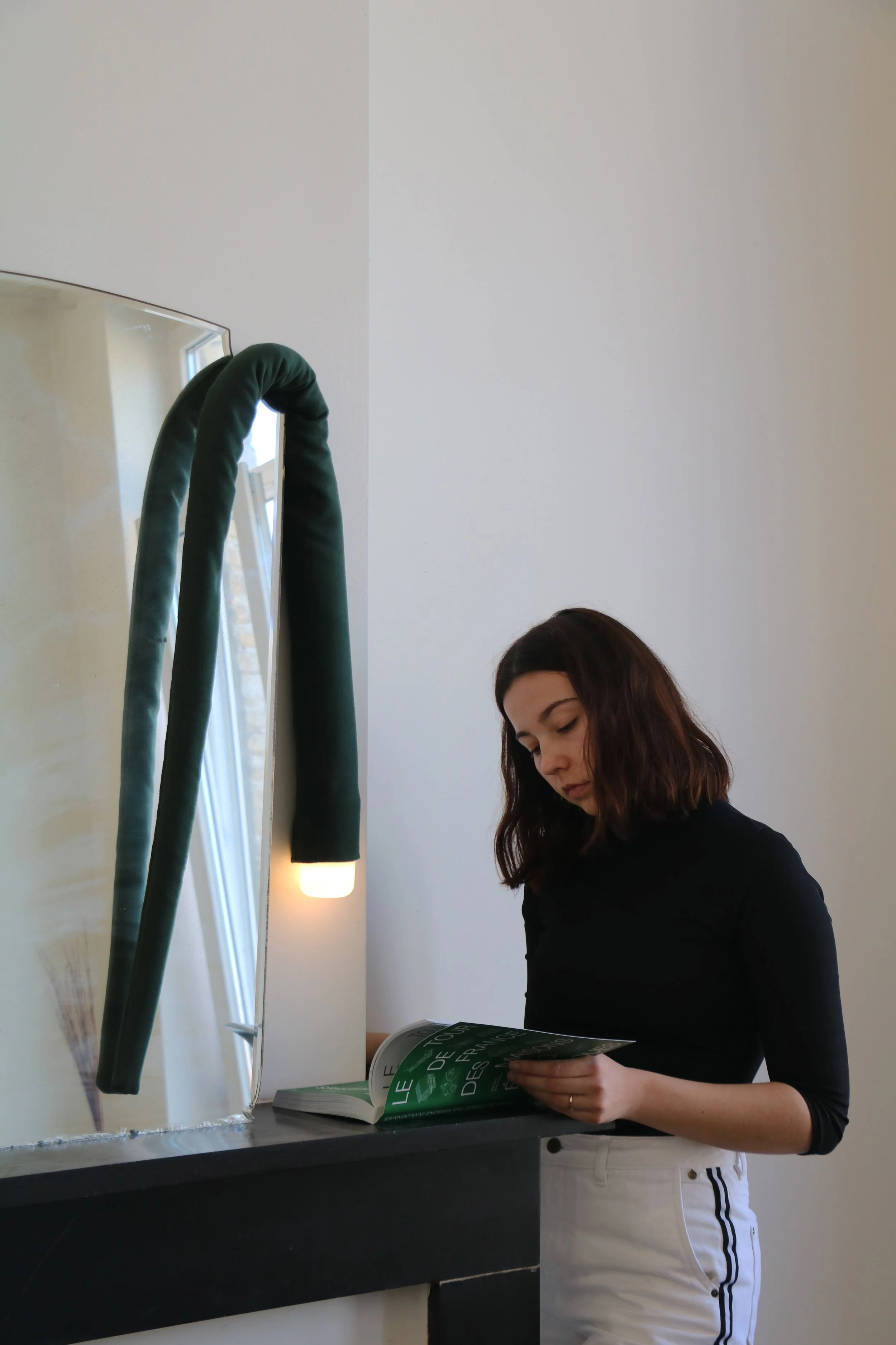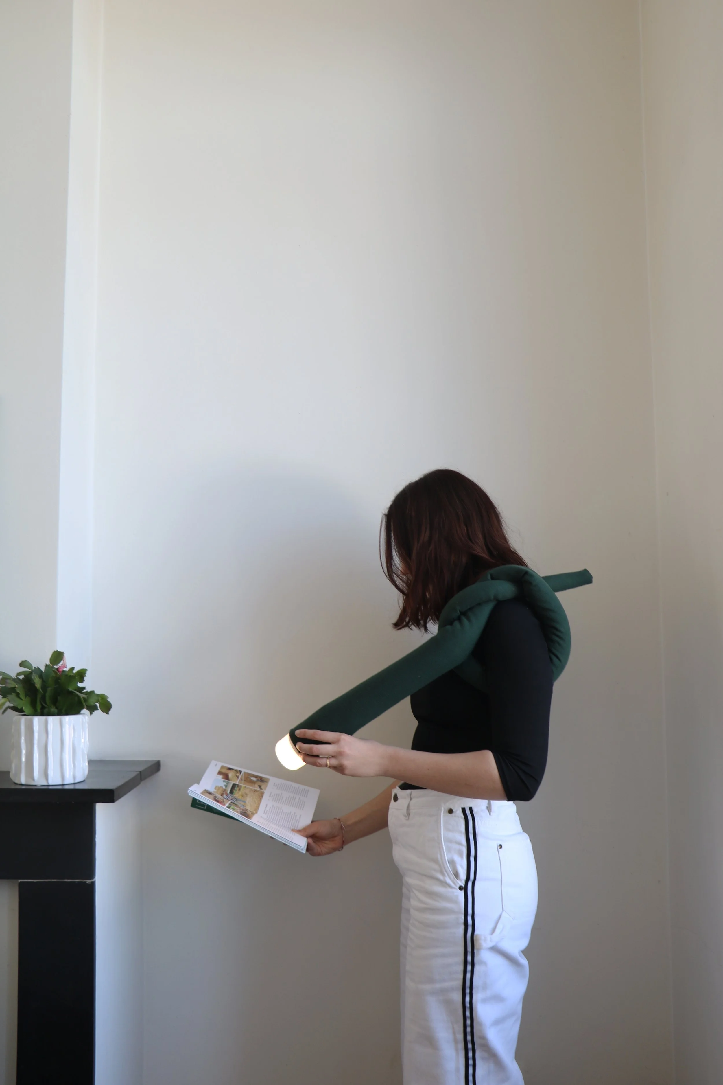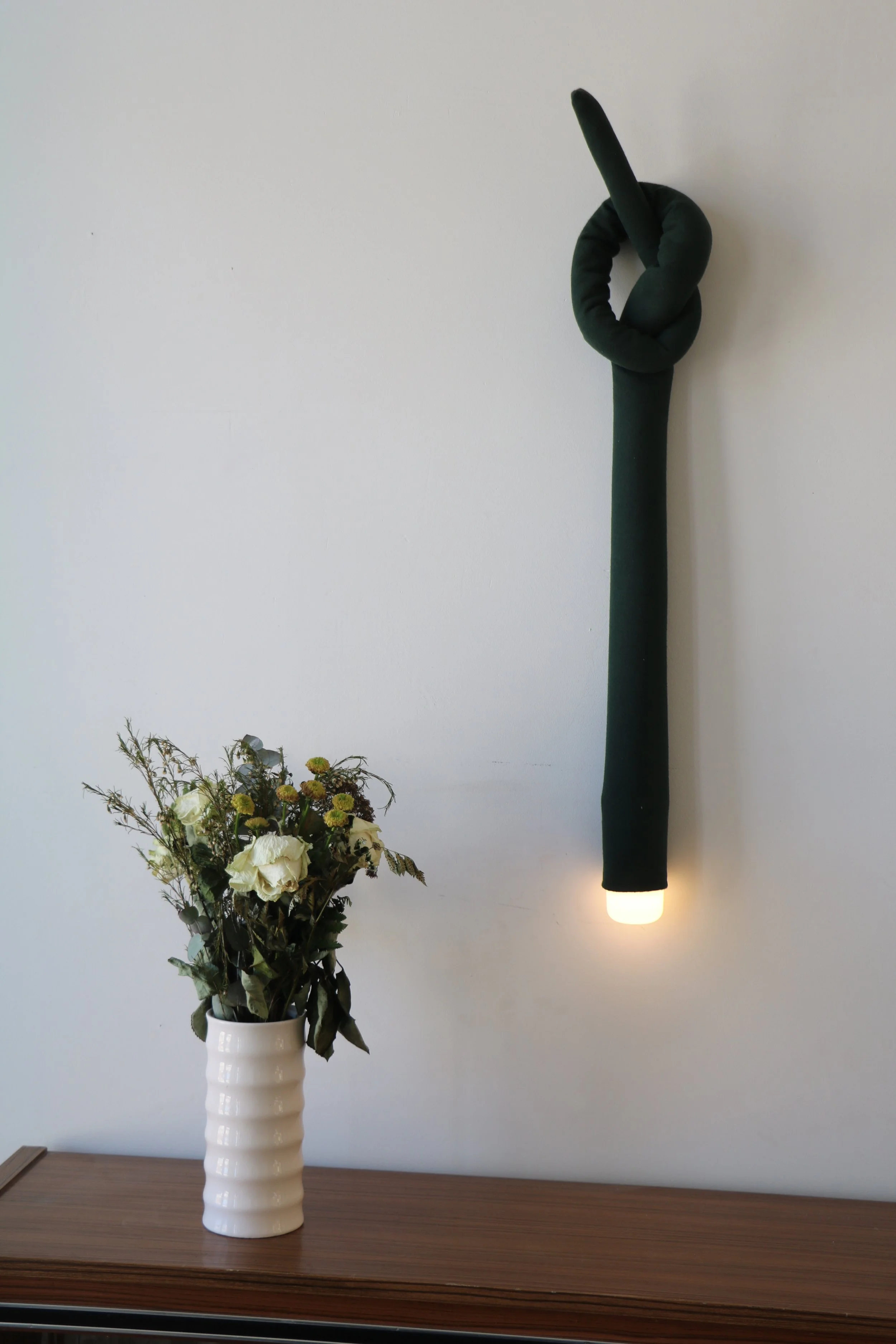La lampe est une baladeuse qui invite à jouer avec la lumière. Par sa longueur, elle serpente dans l’habitat et devient un élément graphique, prolongeant et soulignant les lignes de l’espace. Elle propose une nouvelle manière de s’éclairer, glissant comme un signe lumineux qui révèle les détails qu’elle croise. Mobile et plurielle, elle s’adapte aux envies : veilleuse, applique, lumière nomade. Tel un serpent, elle mue. Sa peau textile enveloppe la tête lumineuse et la métamorphose. La lumière devient un geste, un jeu intuitif et instantané.