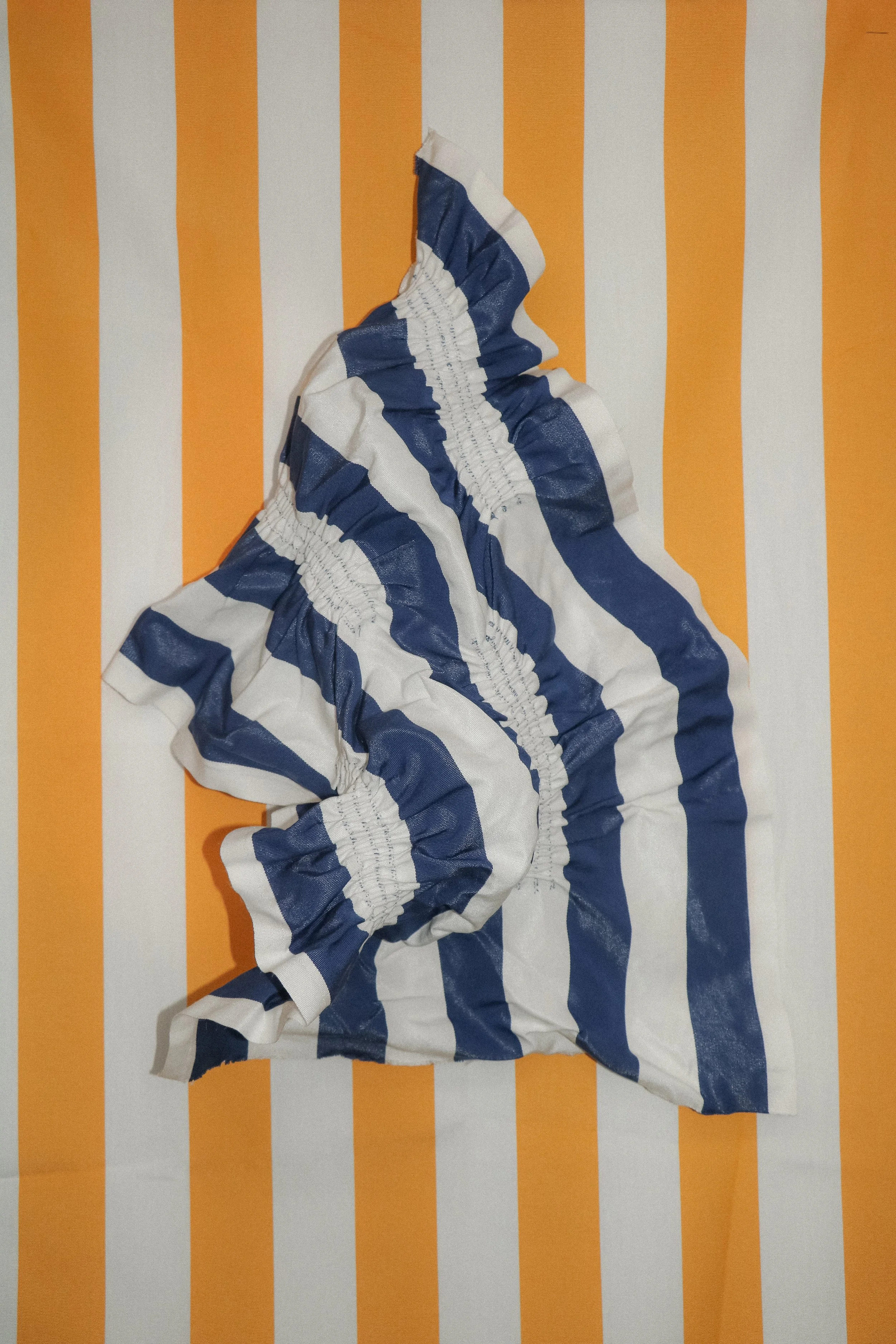 La rencontre de l’élastique et du cabana stripes met les rayures en mouvement. Les aplats s’animent par le biais de déformations, offrant de nouveaux points de vue par des techniques variées. La surface plane s’efface peu à peu, laissant émerger textures et reliefs. La rayure, tendue et transformée, devient un terrain de jeux visuels. L’élasticité insuffle souplesse à la toile de coton, qui gagne en malléabilité. La frontière entre les deux matières se resserre, jusqu’à se fondre l’une dans l’autre et ne former qu’un seul et même langage textile.